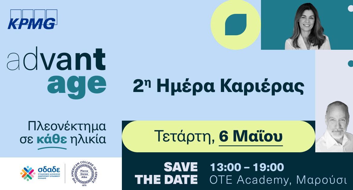 Στο πλαίσιο της πρωτοβουλίας AdvantAge, o ΣΔΑΔΕ με την KPMG και το Αμερικανικό Κολλέγιο Ελλάδος, διοργανώνουν και φέτος, για δεύτερη συνεχόμενη χρονιά, την Ημέρα Καριέρας AdvantAge. Μια ημέρα καριέρας με κύριο στόχο την ενδυνάμωση των ίσων ευκαιριών καριέρας για όλους, χωρίς ηλικιακές και κοινωνικές διακρίσεις!