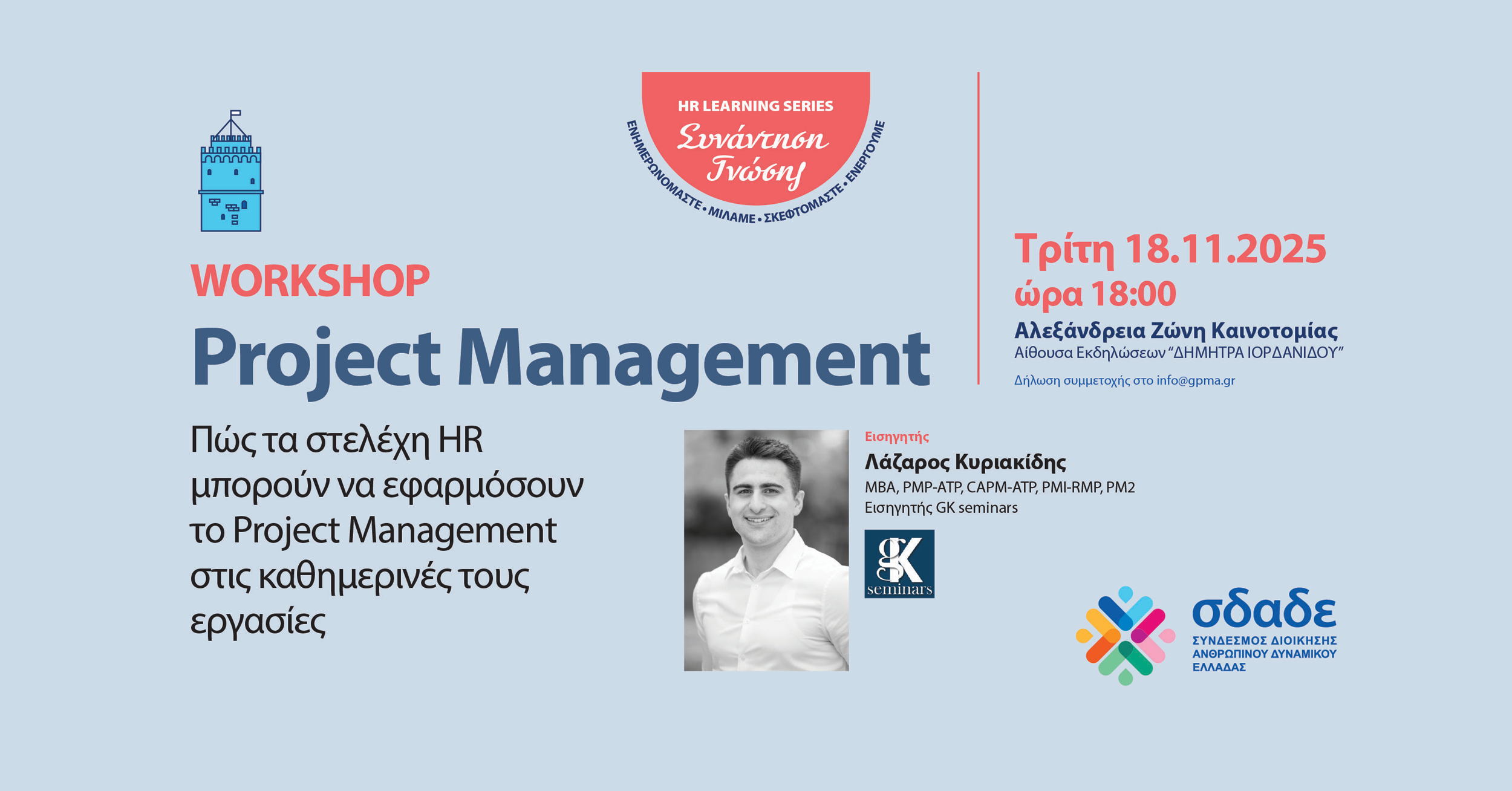 Αλεξάνδρεια Ζώνη Καινοτομίας – Αίθουσα Εκδηλώσεων “ΔΗΜΗΤΡΑ ΙΟΡΔΑΝΙΔΟΥ” Φιλικής Εταιρείας 12 & Ι. Τσιμισκή, Θεσσαλονίκη, GreeceO ΣΔΑΔΕ σας προσκαλεί σε ένα διαδραστικό workshop στη Θεσσαλονίκη με θέμα «Project Management για Στελέχη HR». Μαθαίνουμε πώς οι μεθοδολογίες project management μπορούν να ενισχύσουν την οργάνωση, τον σχεδιασμό και την αποτελεσματική υλοποίηση των HR δράσεων. Εισηγητής ο κ. Λάζαρος Κυριακίδης, PMP®, Managing Director της Success Synthesis.
