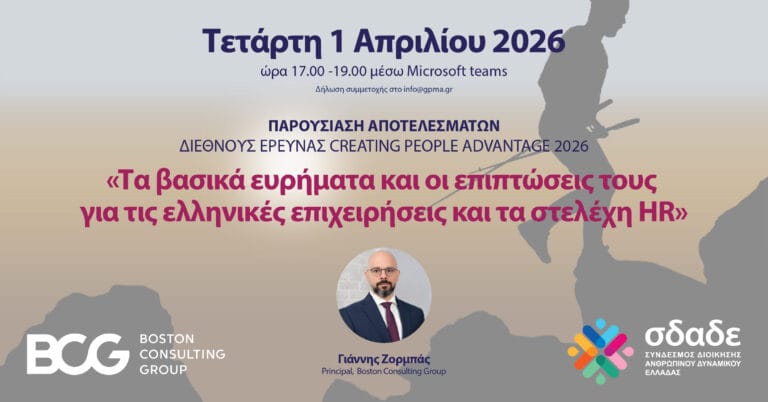 Σας προσκαλούμε την 1η Απριλίου και ώρα 17:00, σε ειδική παρουσίαση των αποτελεσμάτων της διεθνούς έρευνας Creating People Advantage που αφορούν την Ελλάδα.Κόστος συμμετοχής: 30 € για μη μέλη.