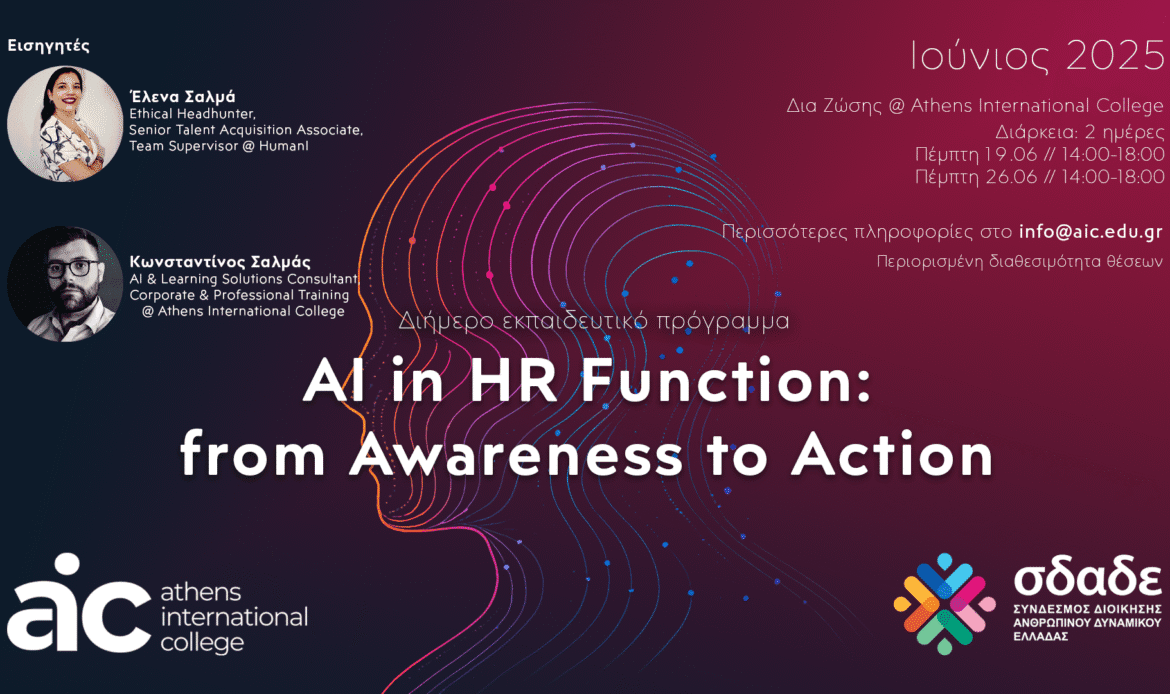 Σας προσκαλούμε στο πρόγραμμα «AI in HR Function: From Awareness to Action» του Athens International College με την υποστήριξη του ΣΔΑΔΕ — ένα πρακτικό, hands-on training για HR professionals που θέλουν να αξιοποιήσουν την Τεχνητή Νοημοσύνη και να δημιουργήσουν τα δικά τους Custom GPTs για τις ανάγκες του HR.