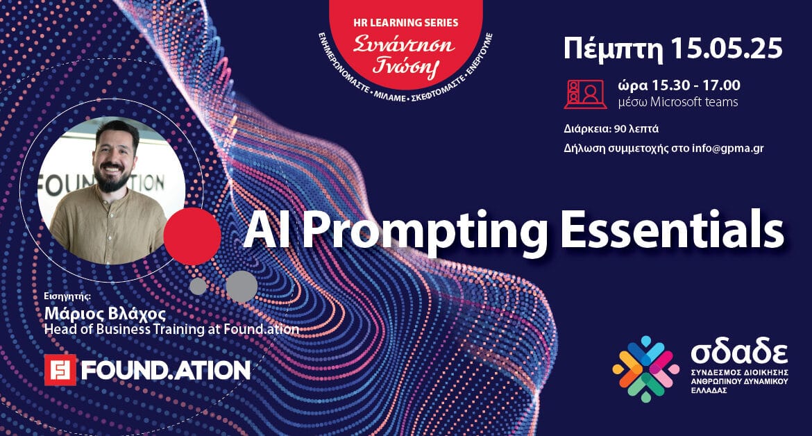 Σας προσκαλούμε στο σεμινάριο «AI Prompting Essentials», την Πέμπτη 15 Μαΐου 2025 (15:30–17:00), στο πλαίσιο της σειράς Learning Series του GPMA | ΣΔΑΔΕ. Ένα πρακτικό 90λεπτο session με τον Marios Vlachos (Found.ation), αφιερωμένο στις τεχνικές δημιουργίας αποτελεσματικών prompts και στην ουσιαστική αξιοποίηση της Τεχνητής Νοημοσύνης στην εργασία.