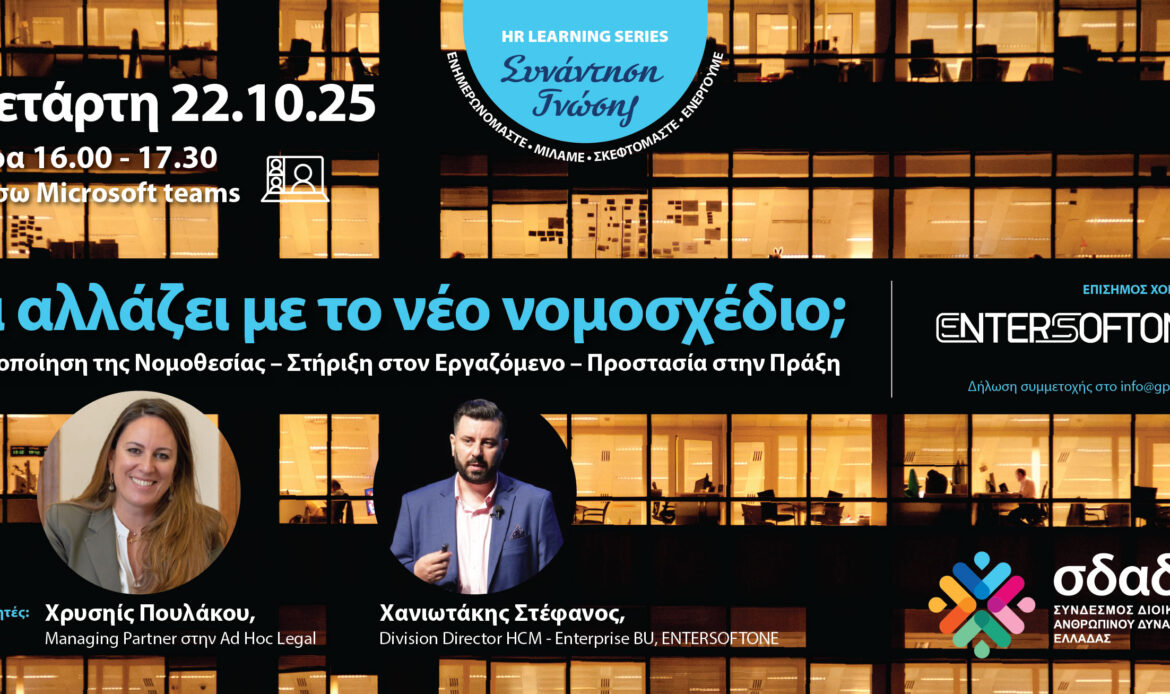 Σας προσκαλούμε στο webinar «Τι αλλάζει με το νέο Νόμο», όπου οι Χρυσίδα Πουλάκου (ADHOC Legal) και Στέφανος Χανιωτάκης (ENTERSOFTONE) θα παρουσιάσουν τις βασικές αλλαγές στις εργασιακές σχέσεις και θα απαντήσουν σε ερωτήσεις των συμμετεχόντων.