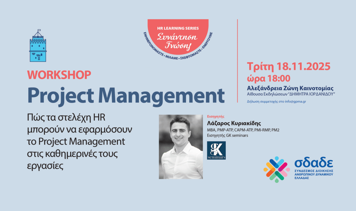 O ΣΔΑΔΕ σας προσκαλεί σε ένα διαδραστικό workshop στη Θεσσαλονίκη με θέμα «Project Management για Στελέχη HR». Μαθαίνουμε πώς οι μεθοδολογίες project management μπορούν να ενισχύσουν την οργάνωση, τον σχεδιασμό και την αποτελεσματική υλοποίηση των HR δράσεων. Εισηγητής ο κ. Λάζαρος Κυριακίδης, PMP®, Managing Director της Success Synthesis.