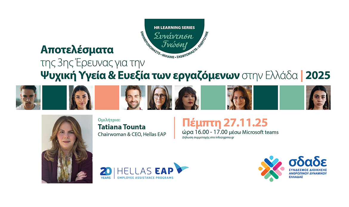 «Αποτελέσματα 3ης Έρευνας Ψυχικής Υγείας και Ευεξίας των εργαζομένων στην Ελλάδα» με ομιλήτρια την κα. Τούντα Τατιάνα Chairwoman & CEO, Hellas EAP