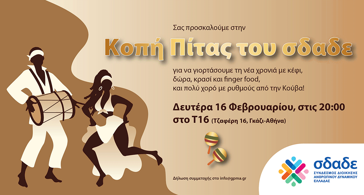Ο Πρόεδρος και τα μέλη του Δ.Σ. σας προσκαλούν στην Κοπή Πίτας του ΣΔΑΔΕ, σε μια βραδιά διαφορετική από τις άλλες, με κρασί, finger food και εκπλήξεις σε κουβανέζικους ρυθμούς που θα μας βάλουν όλους στο κλίμα!